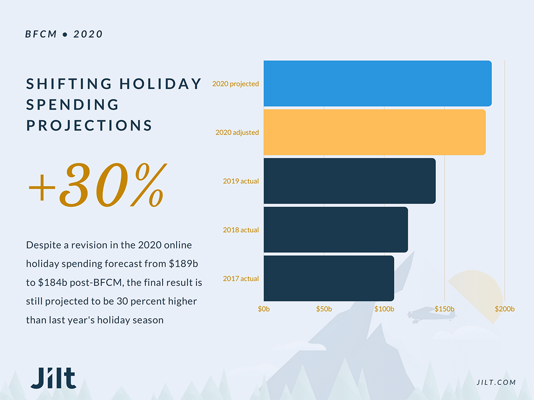- Spending fell short of expectations. The impact of the pandemic has often been hard to predict, and that was true for eCommerce analysts projecting BFCM. For any number of reasons (economic and more), Adobe has revised its forecast for holiday spending in 2020 from $189 billion to $184 billion.
