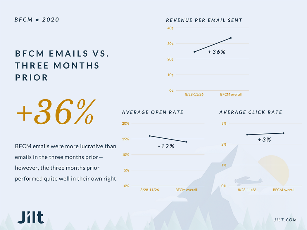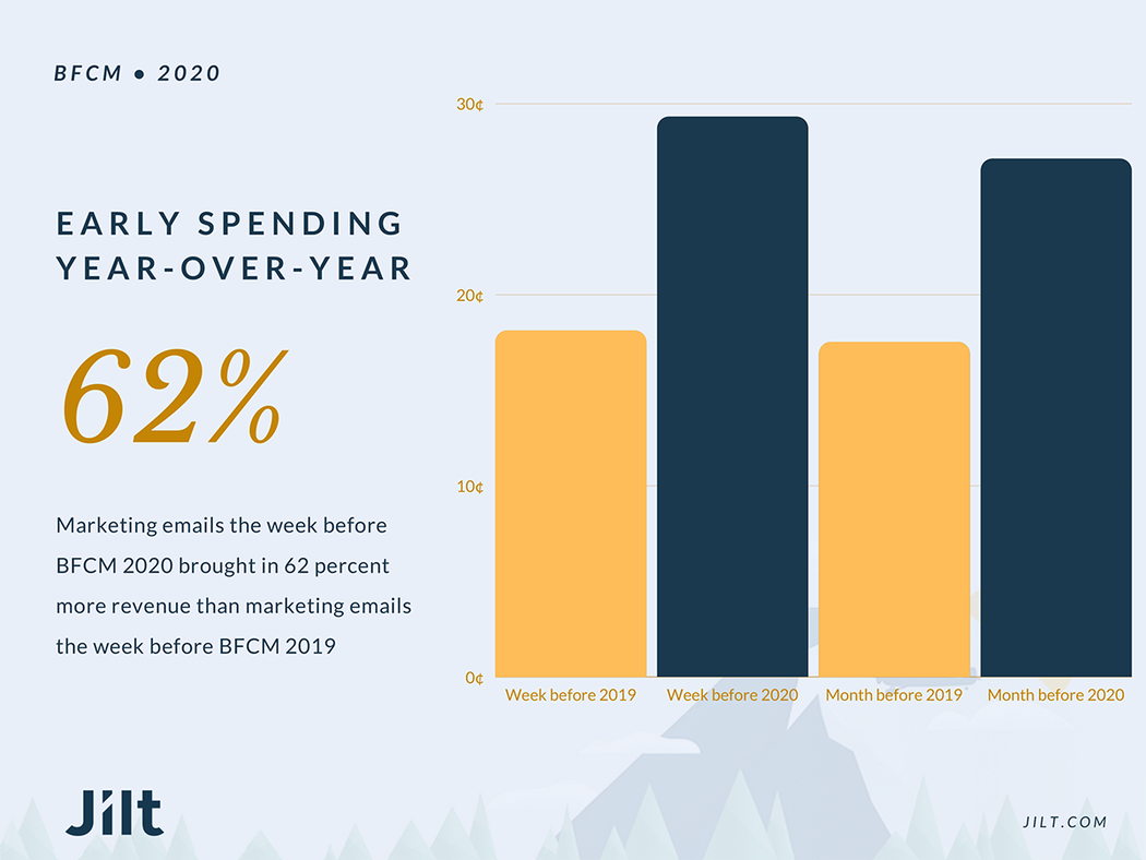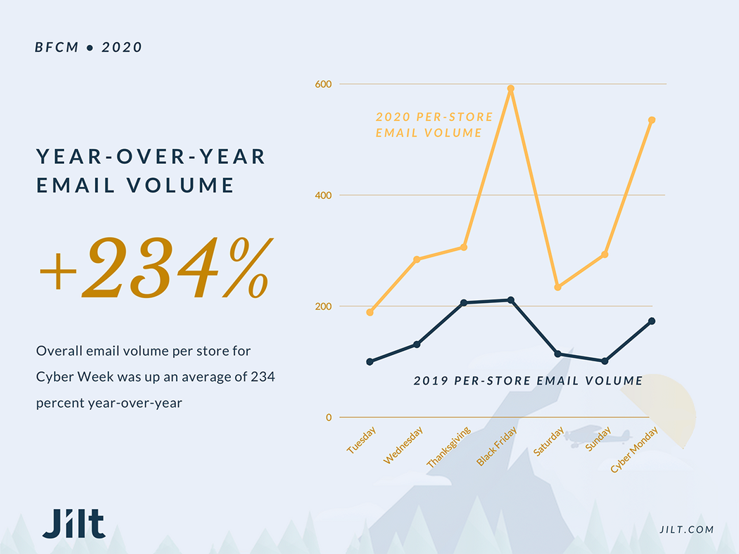 - A higher early send volume—with a strong customer response. Jilt stores sent almost two times more emails in the week leading up to BFCM 2020 than in 2019. And customers responded with a 62 percent increase in year-over-year attributable revenue.
