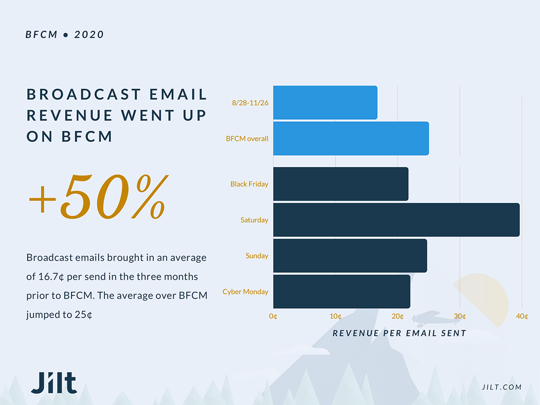 - Broadcast emails shined on BFCM. Broadcast emails saw higher-than-usual revenue-per-send on BFCM. The average broadcast brought in 50 percent more revenue-per-send on BFCM than in the three months prior. That difference can really add up across a large volume of emails.