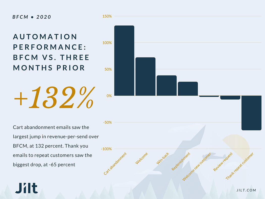 - Some automations shined, others struggled. Cart abandonment emails saw a big increase in opens, clicks, and attributable revenue on BFCM. Welcome emails to new subscribers, win-backs, and replenishment reminders also saw BFCM increases. Three automations saw drops in attributable revenue on BFCM: welcome emails to new customers, review requests, and thank you emails to repeat customers. We have a theory: Customers aren’t looking to make multiple purchases from a store on BFCM—there are just too many other stores to shop from. So encourage shoppers to load up their carts on their first visit, because it might be the only shot you get.