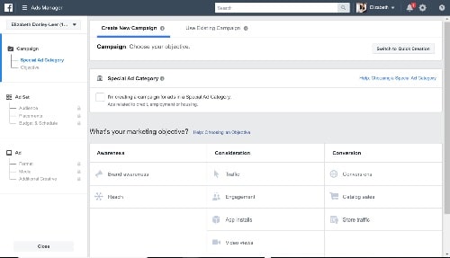 Once there, you will see options to choose your campaign objective, create a special category for the campaign, and define your marketing objective, as well as the option to switch back to the Quick Creation advertisement campaign.