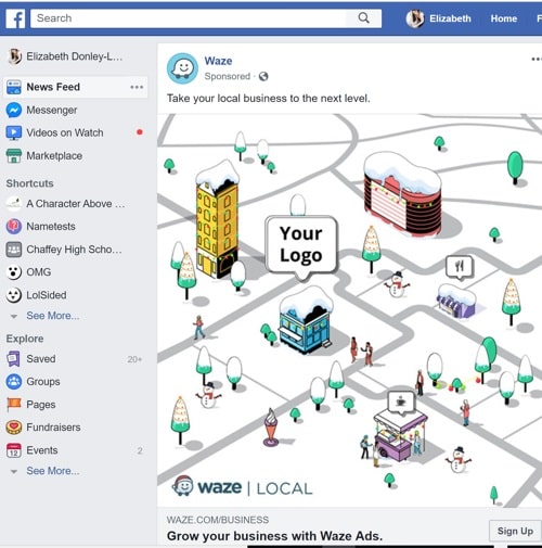 The mind is triggered to take a second look as to how Waze can put your company name out there. The ad below not only catches the Facebook follower's eye as they scroll through their news feed, but it also triggers the viewer to stop and take a second look to see what is being advertised.