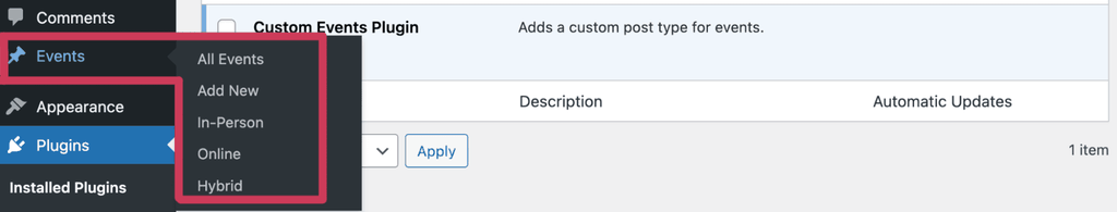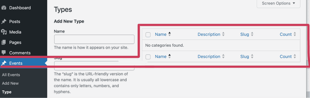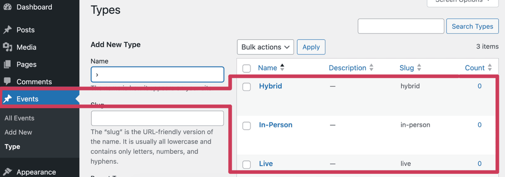 My goal was to create a custom post type — Events — as mentioned, that included one taxonomy called "Types." The three types — known as terms in WordPress speak — would be "In-person", "Live" and "Hybrid."