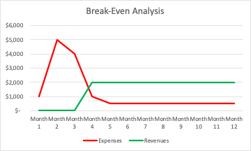 Now you have an expense forecast and an income forecast. You can line those up to find the point where your project breaks even. Here’s an example of a simple break-even analysis:
