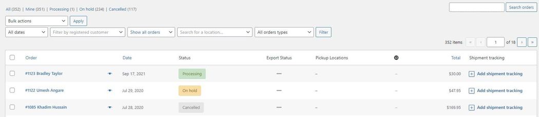 The WooCommerce > Orders page provides a comprehensive of all your past and present orders.