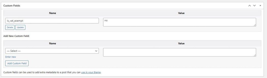 The custom fields section lets you apply your variables to your orders. They do so by adding extra metadata.