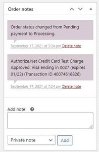 The order notes panel displays status changes and updates for the transaction. Different actions like payments and changes to stock levels will be automatically reflected in the order notes.