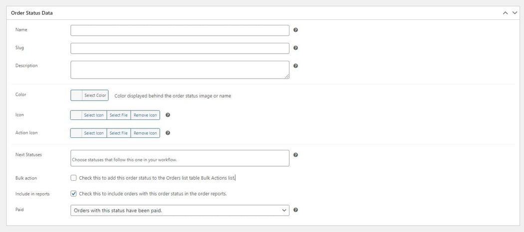 To add a new status click Add Order Status. From the creation page, begin adding the data for the new status. In addition to a name and URL slug, you will need to set a color, icon, action icon, and description.