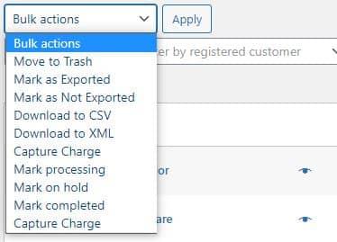 If you want to edit your orders in bulk, you can do so from the dashboard. Click the Bulk actions window to reveal the options. For example, you could change the order status for a group of orders from processing to completed.