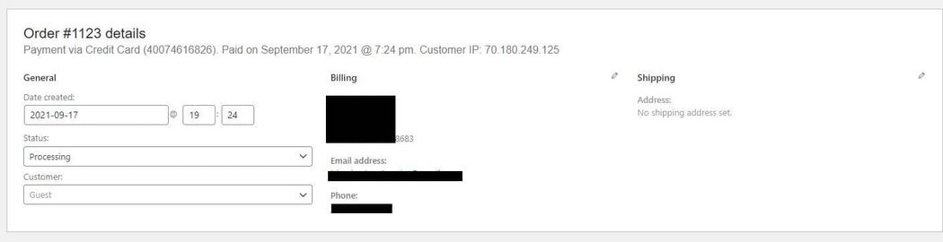 To review the details for a single order, click the link in the Order column. From the order page, you can see the various order details including the customer’s address, phone number, account status, and order status.