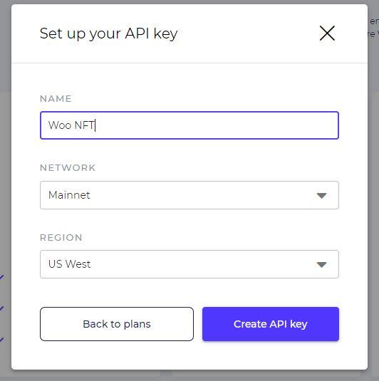 Once you are in the account, select Create API key. You will then receive a prompt to choose a plan. Pick the one that fits your needs, and a box will appear for you to generate your API key. Enter the name for the API, choose a network and a region.