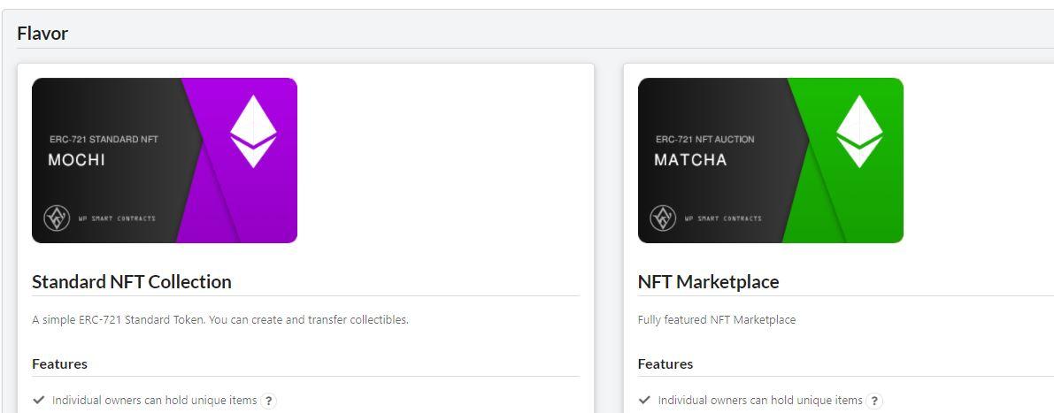 On the next page, scroll down to flavor and choose Matcha. Matcha is an ERC721 marketplace smart contract to deploy on these blockchains.