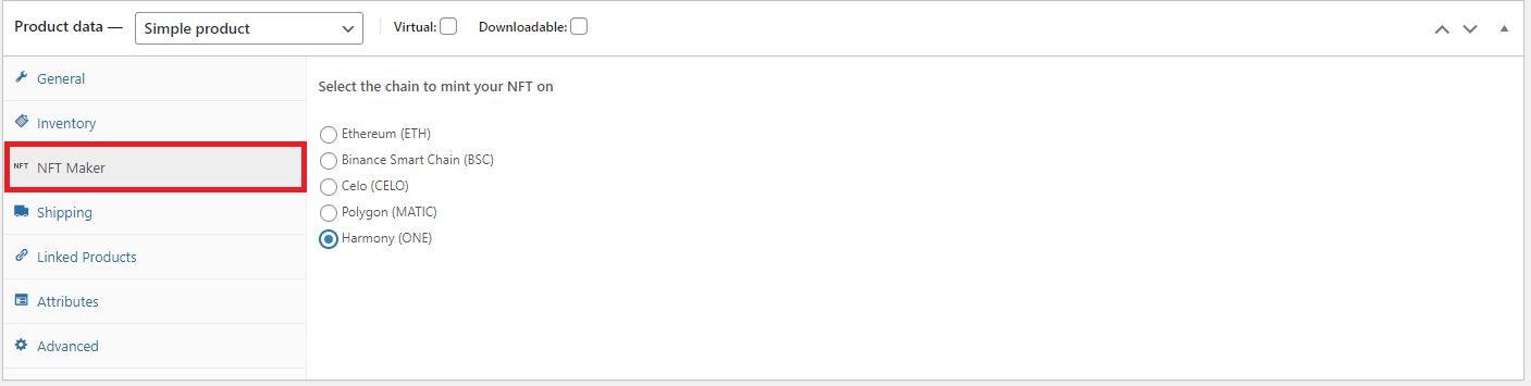 To create an NFT product go to the WooCommerce product catalog and select Add product as you would for any other item. Scroll down to the product data tab and find the NFT Maker section and choose the blockchain to mint your NFT. When you publish the product a new token will be minted.