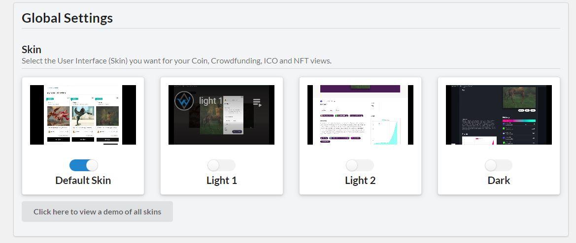 The Skin section is where you will set the appearance for your marketplace. There are four skins to choose from. The setting is applied globally.