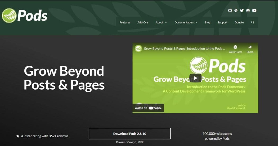 Pods is a standalone, all-in-one plugin for creating custom post types and custom fields, designed by the Pods Framework Team. It allows you to create almost any type of content, regardless of its complexity. A convenient interface helps to manage WordPress CPT and custom fields effectively.