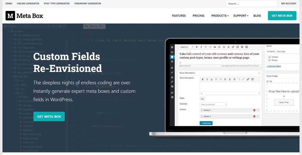 The MetaBox plugin by MetaBox.io is an elaborated and functional plugin WordPress that helps developers save a lot of time working with meta fields of all kinds, such as text, terms, comments, and users.
