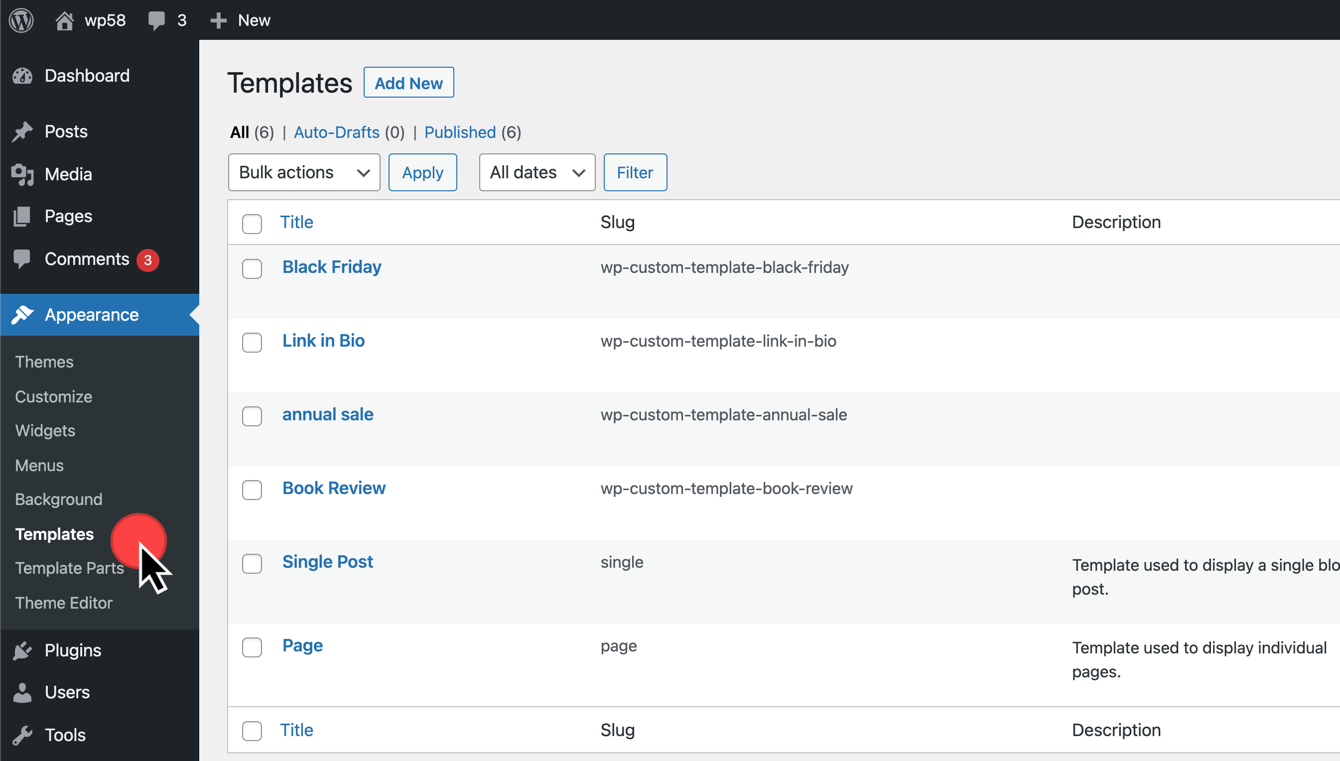 To find Templates, go to Appearance, and then select Templates. Editing from this location is much like editing within the All Posts screen. You can also add a new template here.