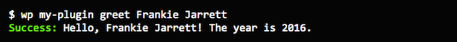 The greeting message in our example above can be displayed a number of different ways using WP-CLI helper methods, each one tailored to a different context.