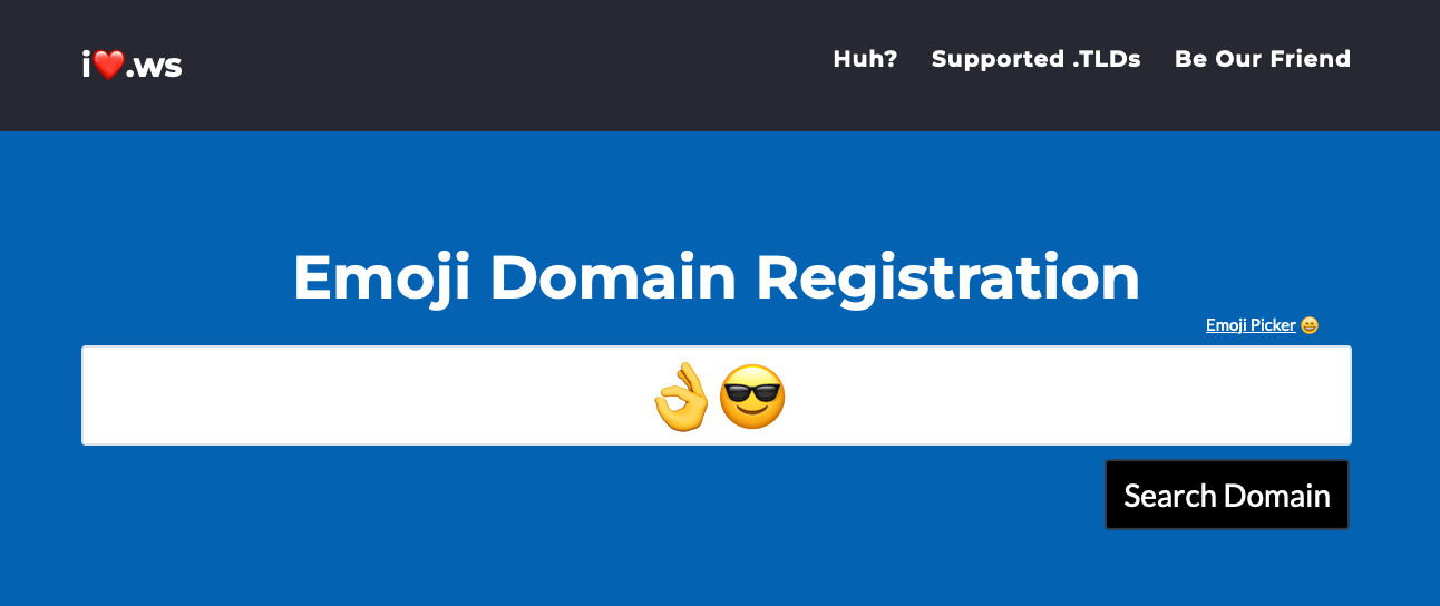 GoDaddy should know. After all, back in 2016 we introduced i❤.ws -- the world’s first Emoji Domain Registration search engine, so people could easily search for, and purchase, emoji-based domain names.