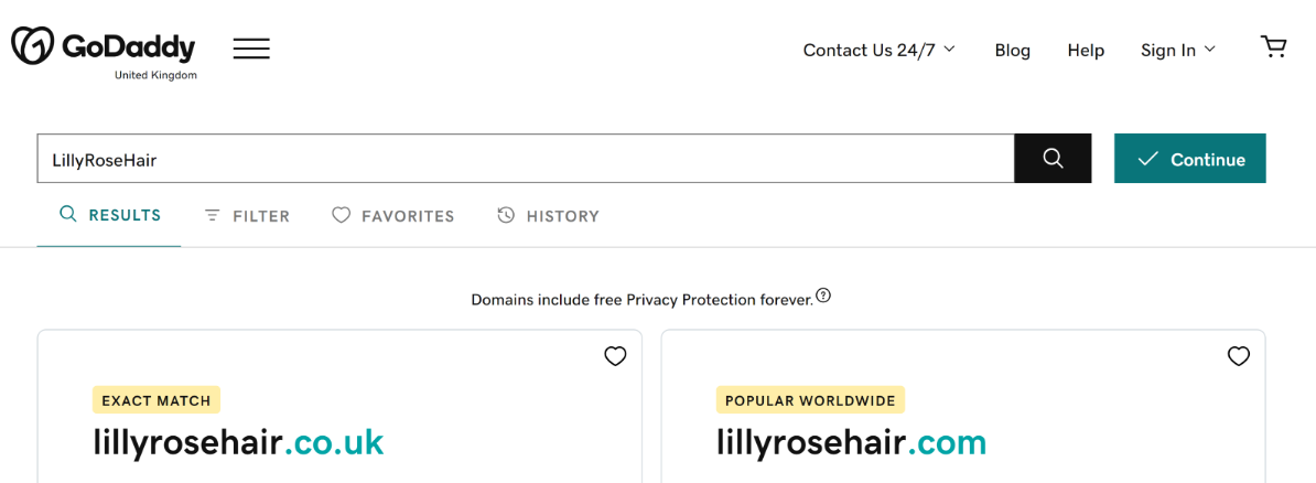 The domain name search results will display the closest match to your desired name as possible. This match may use an ending that’s different to .co.uk or .com. There are hundreds of alternatives out there, from .biz to .lol so keep an open mind.