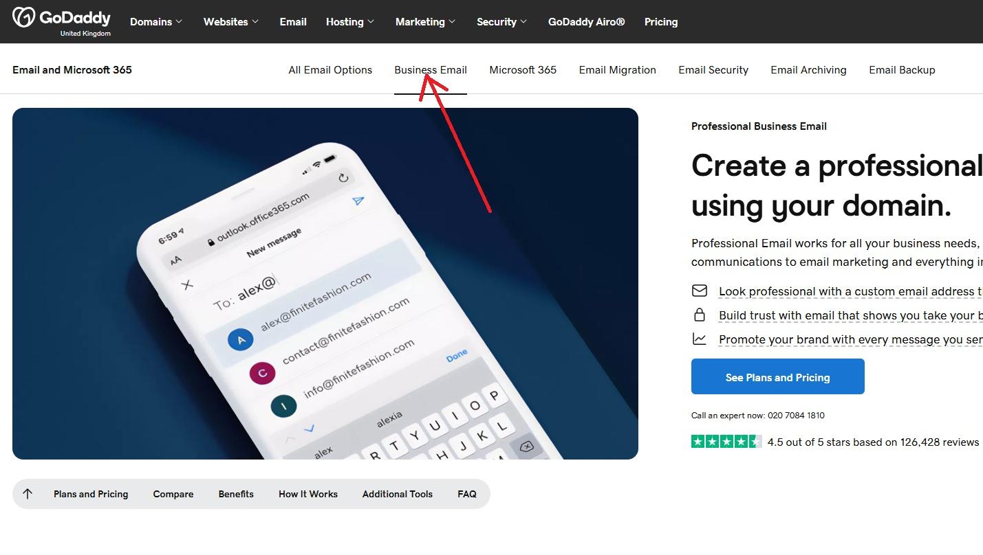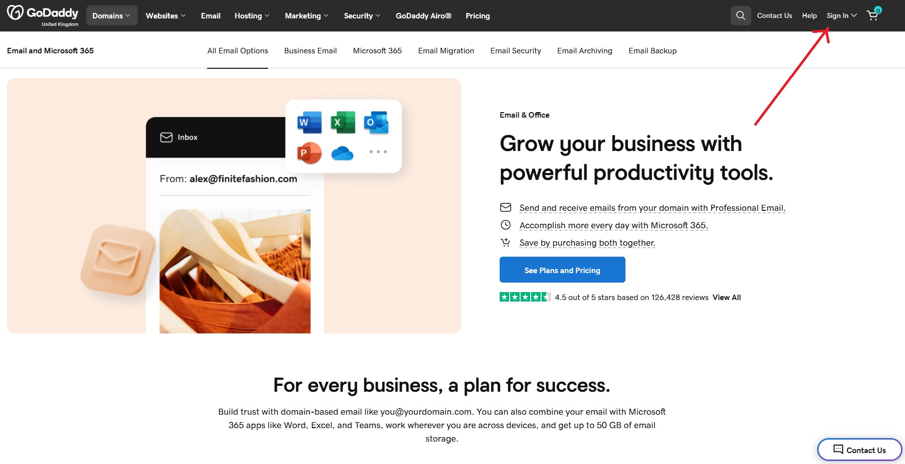 If you don’t already have an email plan, click on the GoDaddy icon in the upper left-hand corner to return to the home page. In the header, click Email, and then click Business Email. If you already have a Microsoft 365 plan, skip to step five.