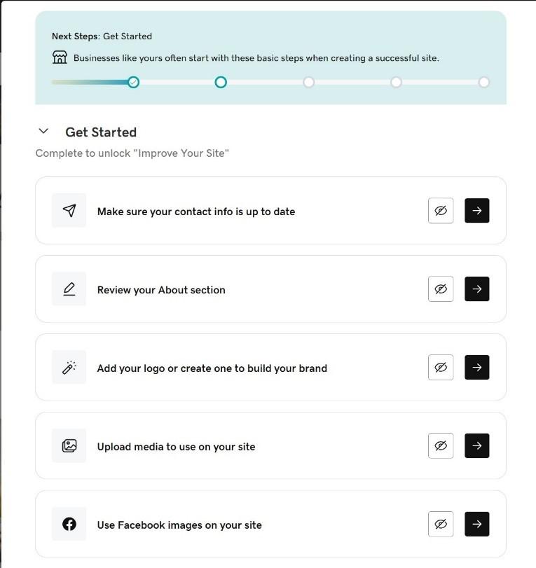As you work on your site, the ‘Next Steps’ feature will give you tips on anything you might have forgotten to include or update.