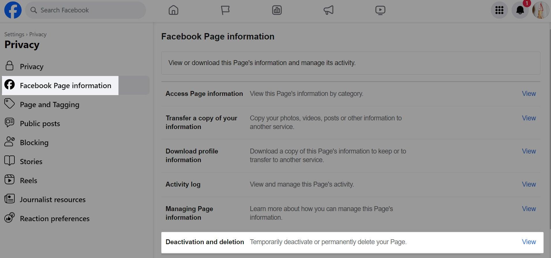 - Click Privacy, select Facebook Page information and then click Deactivation and deletion.