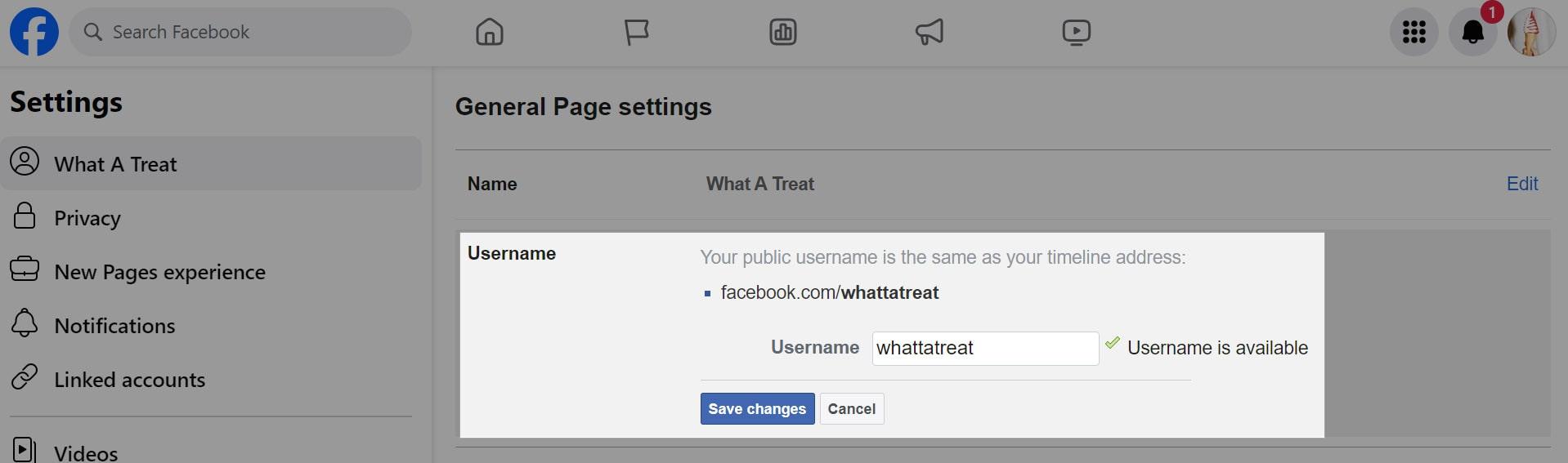 - Update the username field. Unlike your page name, your username must be unique, so you may need to modify it slightly.