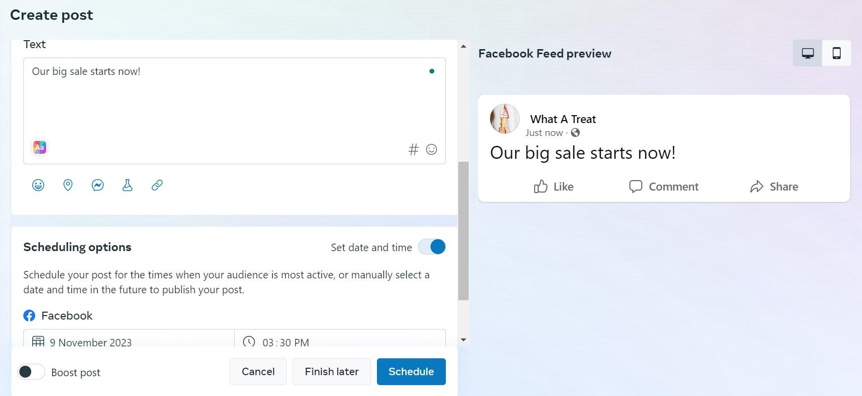 Additionally, if you’re prepping for a big sale or promotional event, it’s worth getting everything set up in Facebook ahead of time so you aren’t rushing to post (and potentially missing an important deadline).